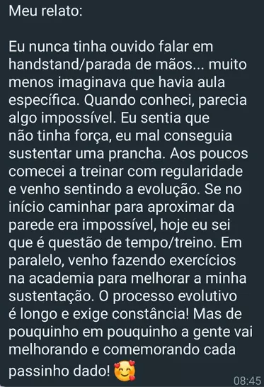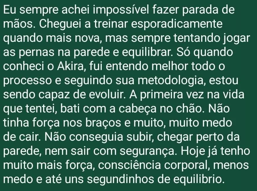 Ao longo dos últimos anos, centenas de pessoas — muitas começando do zero, com medo, insegurança ou achando que já era tarde demais — passaram pelo meu processo de ensino de parada de mãos e utilizando o Mapa da Parada de Mãos e descobriram que sim, é possível.